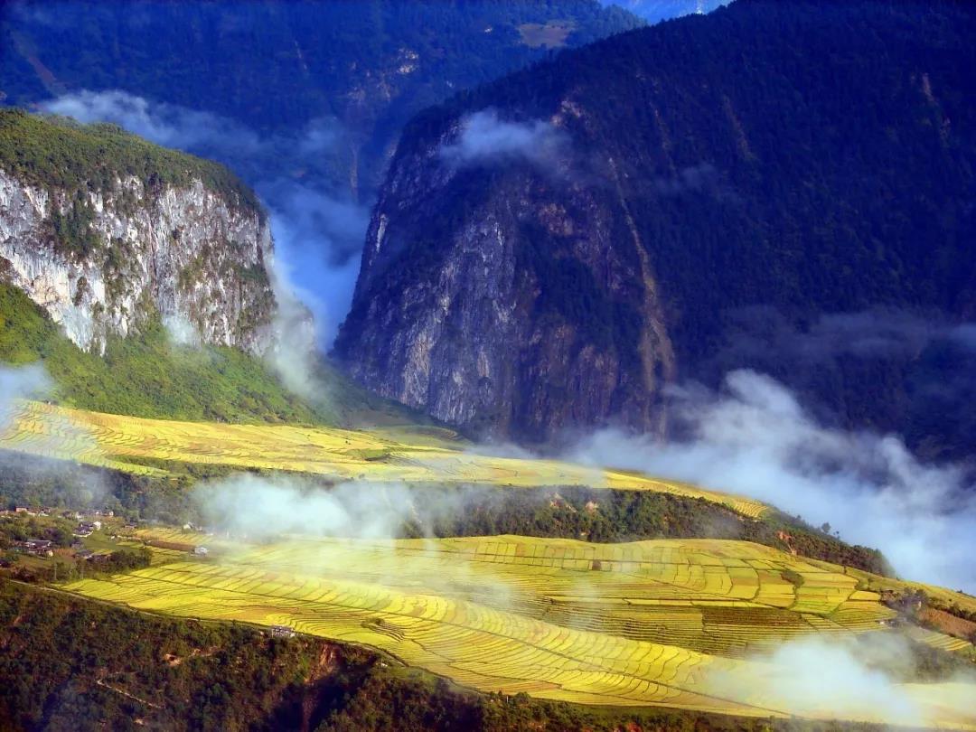 過了怒江第一灣,就到了丙中洛。站在觀景臺上,一邊是人神共居之地——丙中洛。另一邊是怒江上另一顆粉色寶石——桃花島。丙中洛鎮(zhèn)是一片比較平的坡地,四周被群山環(huán)抱,滿目蒼翠。放眼是美麗的田野風光。層層梯田一片金黃,阡陌田園之間,又是綠樹叢林相間。一彎怒江沿著大山邊緣,畫了個弧線流向右方,真是分不清楚是“蓬萊仙閣”還是“人間仙境”。