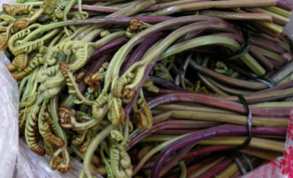 蕨菜總是成片成片的長(zhǎng)著,頂端像五線譜音符一樣,或是稍稍伸出一兩片嫩葉的為最好。彎下腰,右手食指與拇指夾住莖部一掐,幾乎不費(fèi)力就能取到一棵還掛著露珠的鮮嫩的蕨菜。不過(guò)半小時(shí),每個(gè)人都捧了一大把回來(lái)。
