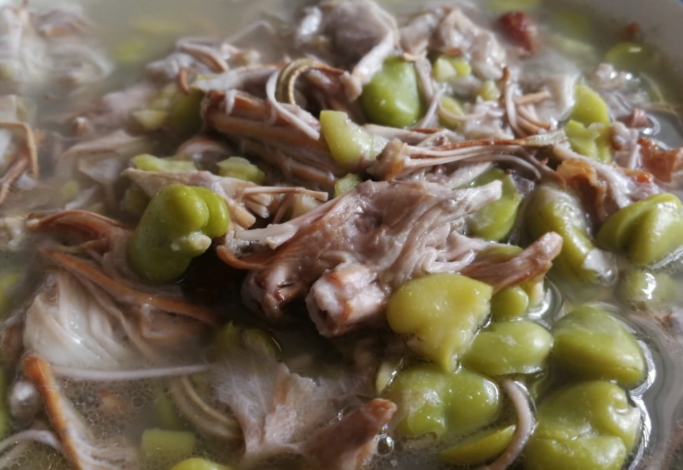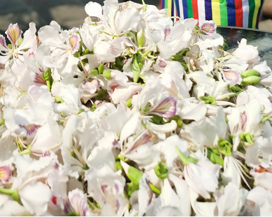 老白花”也是怒江人常食用的一種花朵。“老白花”實(shí)際上就是白花羊蹄甲,與洋紫荊是近親,花期在3-5月,先開(kāi)花后長(zhǎng)葉,花瓣呈白色或淡粉色?;ㄩ_(kāi)時(shí)節(jié),遙看一樹(shù)粉白。立于樹(shù)下,但見(jiàn)五片花瓣輕盈舒展開(kāi)來(lái),朵朵分明,宛如千萬(wàn)彩蝶落了滿樹(shù)。尋個(gè)樹(shù)旁的高處,三下五除二就能摘得一簸箕回家。涼拌白花是最簡(jiǎn)單的一種吃法,焯水洗凈后,配上自家秘制的辣醬,花朵的清香與鮮辣交織,寵壞你的味蕾。焯水后的白花也可以清炒,或與豆豉、臘肉同炒。講究的人家,去除萼片、花托,焯水漂洗浸泡后,與青豆米同煮。幾十分鐘,一盆翠白相間的白花豆米湯便躍然眼前。嘗一口,滿口鮮香,春天的滋味就這樣滑到了嘴里。
