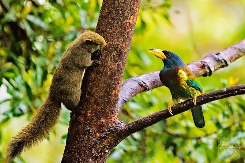 大擬啄木鳥和赤腹松鼠奪食。類似場景在高黎貢山每天都會上演。