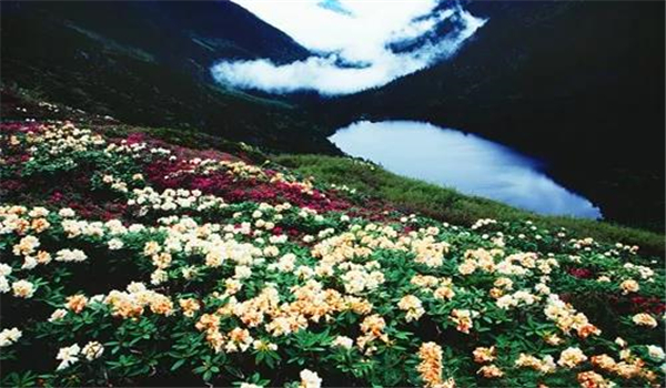 春夏之交,氣溫逐漸升高,雪山上冰消雪融,雪退到哪里,花就開到哪里,從山上到湖邊,到處是一片花的海洋,清碧透亮的湖水,映照著無邊的原始森林和空闊的藍天,最具特色的是高山杜鵑,它們盤根錯節(jié)地葡伏生長,密密麻麻,殘雪還掛在枝葉間就把鮮花怒放,遠遠看去就象燃燒的火焰在狂風中飄搖。