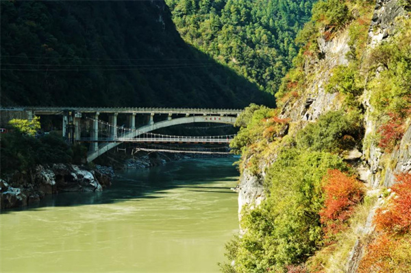 峽谷底部是奔騰而過的怒江水流