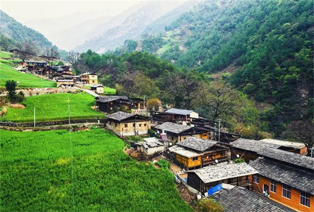 霧里村,是丙中洛往北去10公里的小村子,大片濃密的翠綠中,一座座高腳木樓(木楞房)錯落有致,樓頂?shù)那嗍逭凵渲疑墓?。清晨云霧繚繞,和著炊煙,仙境不過如此。
