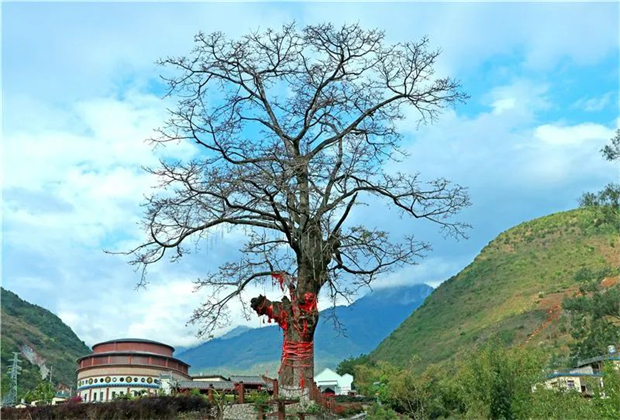 千年古樹木棉紅,萬年福佑有緣人。一棵挺拔磅礴的古樹木棉紅屹立在百花梯田畔,枝繁葉茂,樹干上纏繞著的紅色布條,飽含人們對美好生活的向往與期盼。