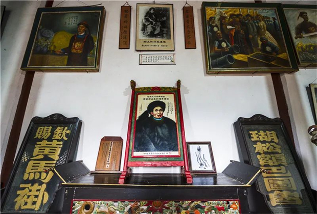 塑像后面又是一棟房子,門首掛著“楊玉科將軍史料陳列展覽”的木匾,進(jìn)入屋內(nèi),正面靠墻壁擺著一張八仙桌,上面放著楊玉科遺照和家譜。遺照兩側(cè),橙底黑字,寫著“名垂青史音容在,功著神州德澤沈”幾個大字。八仙桌兩邊放著御賜的鍍金牌匾,左邊是“御欽黃馬褂”,右邊是“瑚松額巴圖魯”。