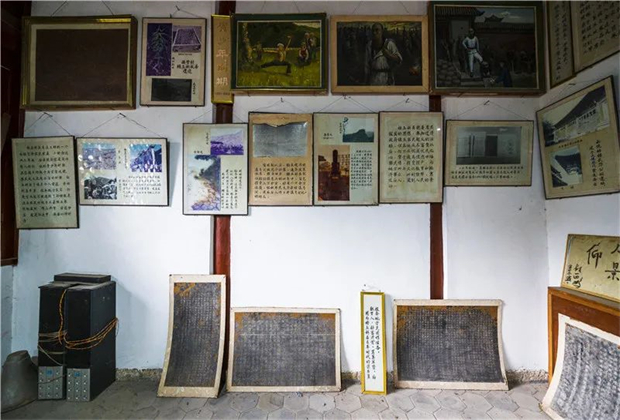 墻壁上掛著楊玉科將軍出征鎮(zhèn)南關(guān),身先士卒抗擊法國侵略軍的油畫。屋內(nèi)有一排玻璃柜,放著《蘭坪縣志》《營盤鎮(zhèn)志》以及有關(guān)楊玉科將軍的一些史料書籍。