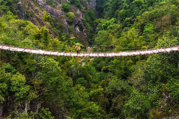 走過連接鄉(xiāng)里和村里的鐵索橋