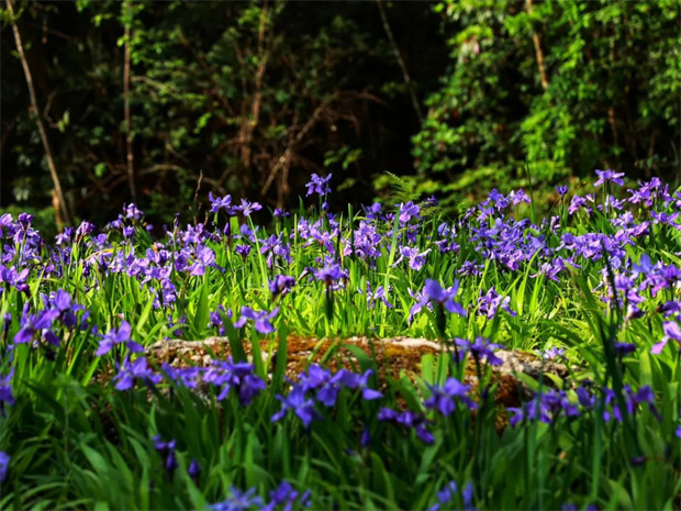 親密接觸。遠處,那些錯落有致的鳶尾花與周圍的山林相互映襯,讓靜寂的山林多了幾分嫵媚與溫馨。