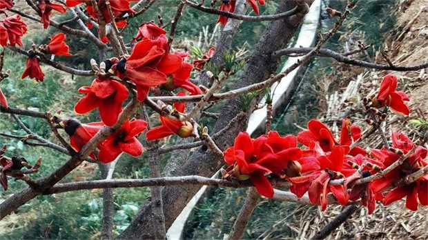 田壟間油菜花早已鋪成金色花海,微風(fēng)拂過(guò),金浪翻涌,蜂蝶翩躚。沿江木棉熱烈盛放,一樹(shù)樹(shù)熾烈火紅,映著碧綠江