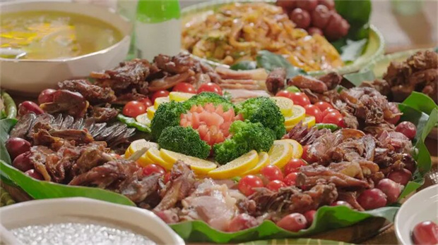 被譽(yù)為“峽谷風(fēng)味”代表的傈僳族手抓飯。芭蕉葉為盤,盛放著草果燉雞、老窩火腿、烤乳豬等特色佳肴,色彩斑斕如民