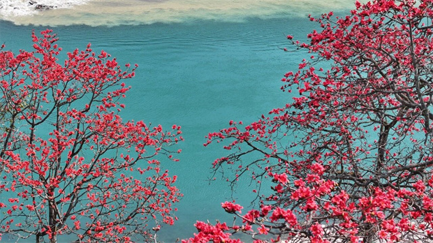 色彩;有的花蕾滿枝,陸續(xù)綻放星星點點的紅花,在藍天、白云、碧江的映襯下,更顯得嬌艷無比。來自四川的游客開